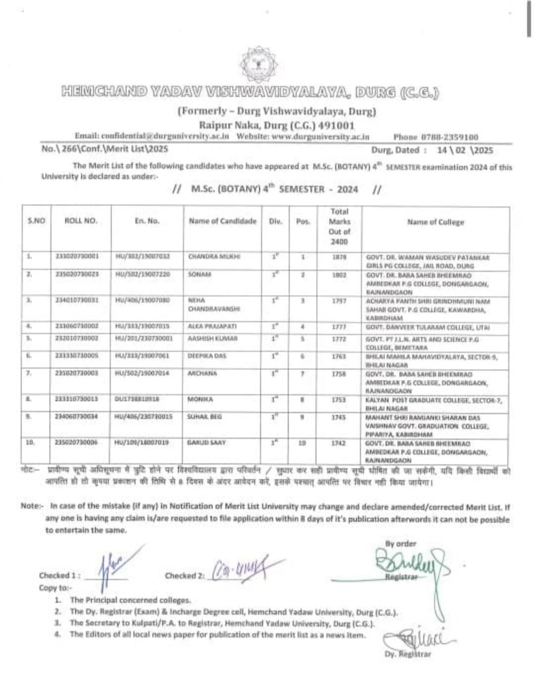 बालोद सजग प्रहरी। हेमचंद यादव विश्वविद्यालय दुर्ग छत्तीसगढ़ द्वारा विश्व विद्यालय मेरिट लिस्ट जारी किया, जिसमें बालोद जिले के वनांचल ग्राम अरजपुरी के गरुड़ साय मंडावी ने यूनिवर्सिटी के टॉप 10 लिस्ट में अपनी उपस्थिति दर्ज कर अपने गांव सहित पूरे जिले का नाम गौरवान्वित किया है।