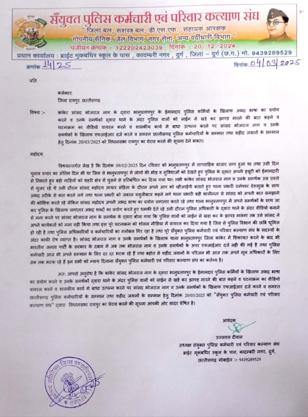 वहीं छत्तीसगढ़ राज्य के पुलिस कर्मचारी आज भी अपने सम्मान के लिए दर दर भटक रहे हैं तथा बहुत से शहीद जवानों के परिजन भी आज तक अपने मूल अधिकारों के लिए अब तक भटक रहे हैं तथा सँयुक्त पुलिस परिवार जिसमे जिला बल, सशस्त्र बल, सहायक आरक्षक, डी एस एफ, गोपनीय सैनिक, नगर सेना सहित जेल विभाग की भी बहुत सी माँगें आज भी लंबित हैं और उन पर कार्यवाही नही हो रही है । इसलिए इन सभी को न्याय दिलाने हेतु उज्जवल दीवान के नेतृत्व में सँयुक्त पुलिस कर्मचारी एवं परिवार कल्याण संघ अपने कर्तव्य का पालन करते हुए कांकेर सांसद भोजराज नाग के द्वारा भानुप्रतापपुर के ईमानदार पुलिस कर्मियों के खिलाफ अभद्र भाषा का प्रयोग करने व उनके समर्थकों द्वारा थाने के अंदर पुलिस वालों को लाईन से खड़े कर झापड़ मारने की बात कहने व घटनाक्रम का वीडियो वायरल करने व शासकीय कार्य मे बाधा उत्पन्न करने पर सांसद भोजराज नाग व उनके समर्थकों के खिलाफ एफ आई आर दर्ज करने व समस्त छत्तीसगढ़ पुलिस कर्मचारियों के सम्मान तथा शहीद जवानों के सम्मान व पुलिस परिवार की मांगों को पूरा करवाने हेतु दिनांक 20/03/2025 को विधानसभा रायपुर का घेराव करेंगे जो रैली के रूप में दोपहर 12 बजे भाठागांव बस स्टैण्ड से शुरू हो कर घड़ी चौक, शंकर नगर होते हुए विधानसभा का घेराव करने पहुचेंगे। इस प्रदर्शन में सम्पूर्ण छत्तीसगढ़ के लगभग तीस से चालीस हजार पुलिस परिवार के सम्मिलित होने का अनुमान है।