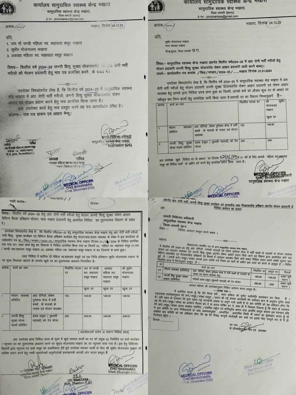 कथित रूप से दिनांक 24.12.2023 को सत्र 2024- 25 में जननी शिशु सुरक्षा और अन्तः रोगी भर्ती मरीजों को भोजन प्रदायगी हेतु भाव पत्र आमंत्रित किया गया था। जिसमे जय माँ चंडी महिला स्व सहायता समूह, सुधीर भोजनालय एवं आकांक्षा महिला स्व सहायता समूह से भाव पत्र लिया गया है। जिसका तुलनात्मक अध्ययन वाले नोटशीट में तीन लोग हस्ताक्षर कर प्रक्रिया को पूर्ण कर सुधीर भोजनालय को कार्यादेश जारी किया गया है। लेकिन इसमें भी बड़ा आरोप है कि व्यक्ति विशेष को अनुचित लाभ पहुंचाने की नियत से उक्त भोजन प्रदायगी बाबत किसी भी राष्ट्रीय या प्रादेशिक समाचार पत्रों में भाव–पत्र आमंत्रित हेतु इश्तहार प्रकाशन ही नहीं किया गया है।