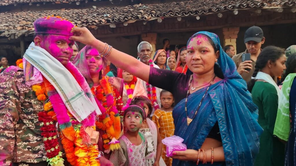 जवान का ग्रामीणों ने फूल हार पहनाकर किया स्वागत, फूलों की वर्षा करते हुए कहा, हमें तुम पर गर्व है।