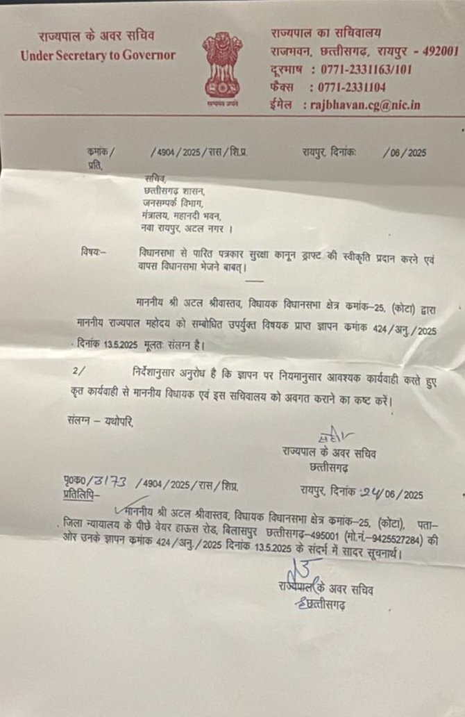 पत्रकार सुरक्षा कानून को लेकर बिलासपुर विधायक अटल श्रीवास्तव के पत्र पर राज्यपाल ने छत्तीसगढ़ शासन को लिखा खत।