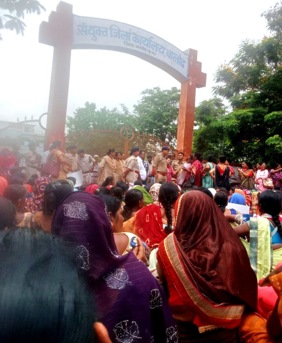 हजारों की संख्या में मितानिनों ने बरसते पानी में संयुक्त जिला कार्यलय बालोद के बाहर प्रदर्शन करते हुए।
