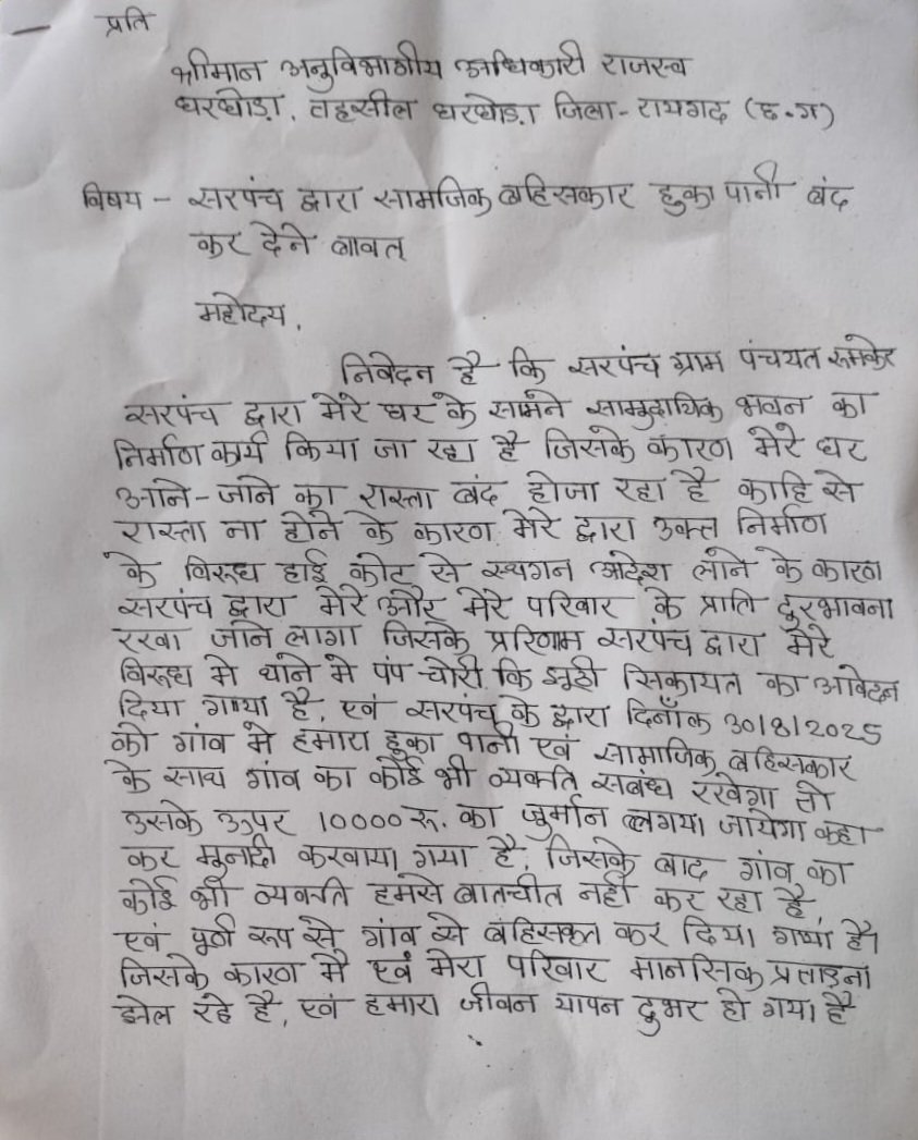 उन्होंने बताया कि दिनांक 30/8/2025 को सरपंच के द्वारा गांव में हमारा हुका पानी बंद कर सामाजिक बहिष्कार कर दिया है तथा उनके द्वारा फरमान जारी किया गया है कि गांव का कोई भी व्यक्ति हमसे सबंध रखेगा तो उसके ऊपर 10000 रु. का जुर्मान लगाया जायेगा। अवगत हो कि सरपंच ने बकायदा मुनादी करवाकर फरमान जारी किया है जिसके कारण गांव का कोई भी आदमी हमसे बातचीत नहीं कर रहा है। परिणाम स्वरूप हमरा पूरा परिवार एकांकी जीवन जीने मजबूर है तथा लगातार मानसिक रूप से प्रताड़ित हो रहे हैं।