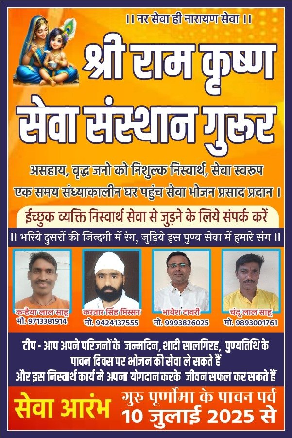नर सेवा ही नारायण सेवा है कि धारणा से प्रेरित बालोद जिला अंतर्गत संचालित श्रीराम कृष्ण सेवा संस्थान गुरुर निःस्वार्थ सेवा हेतु संकल्पवान सेवाभावी लोगों का समूह है जो कि हमारे आसपास के ऐसे वृद्धजन जो असहाय हैं, लाचार हैं, जरूरतमंद हैं उन्हें प्रतिदिन भोजन प्रसाद उपलब्ध कराया जा रहा है तथा यथासंभव उनकी अन्य सहायता भी की जा रही है जो कि इस संस्था का बेहतरीन एवं सराहनीय तथा अनुकरणीय पहल है।