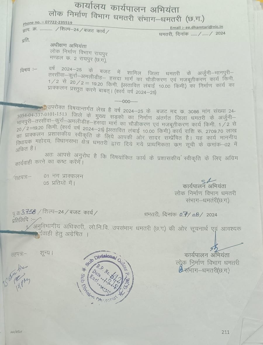 विदित हो कि उक्त सड़क को लेकर धमतरी विधायक ओंकार साहू के अनुशंसा पर कार्यपालन अभियंता लोक निर्माण विभाग धमतरी ने अधीक्षण अभियंता लोक निर्माण विभाग रायपुर को पत्र के माध्यम से अवगत कराया है कि वित्तीय वर्ष 2024–25 के बजट मद क्रमांक 3086 मांग संख्या 24– 5054–04 –337–0101–1513 जिले के मुख्य सड़कों का निर्माण अंतर्गत जिला धमतरी के अर्जुनी, भानपुरी , तरसीवा, कुर्रा, अमलीडीह, हसदा मार्ग दस किलोमीटर का चौड़ी करण एवं मजबूतीकरण लागत राशि 2709.70 लाख रुपए का प्राक्कलन प्रशासकीय स्वीकृति बाबत प्रेषित किया गया है।