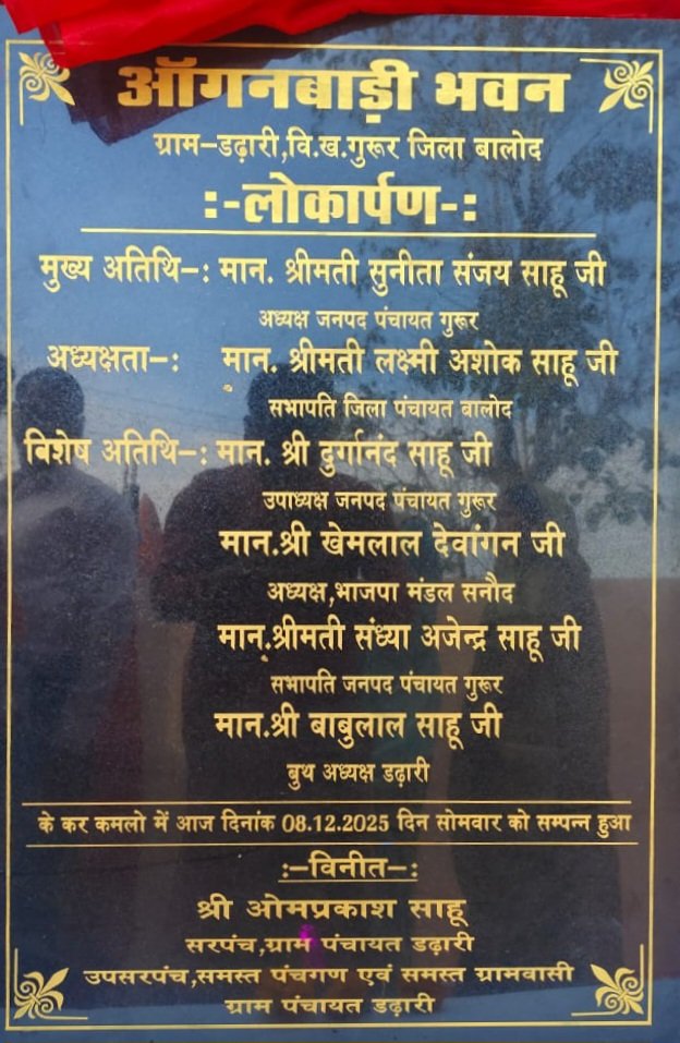 बालोद सजग प्रहरी। बालोद जिला अंतर्गत गुरूर विकास खण्ड के ग्राम पंचायत डढ़ारी में महिला बाल विकास विभाग द्वारा स्वीकृत आंगनबाड़ी भवन निर्माण कार्य का दिनांक 08 दिसम्बर 2025 को क्षेत्र के निर्वाचित जनप्रतिनिधियों के कर कमलों से लोकार्पण कार्य संपन्न हुआ।