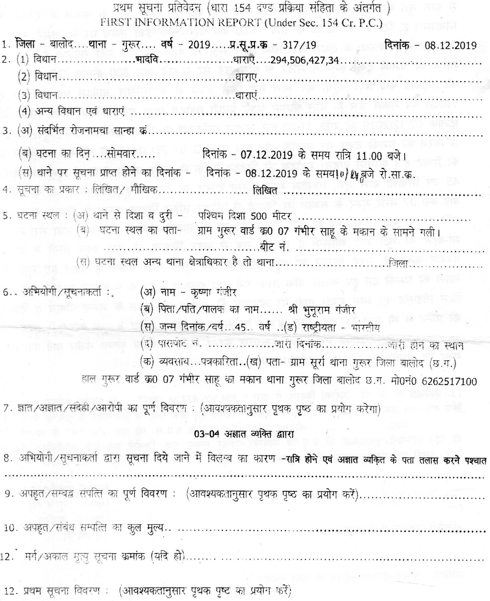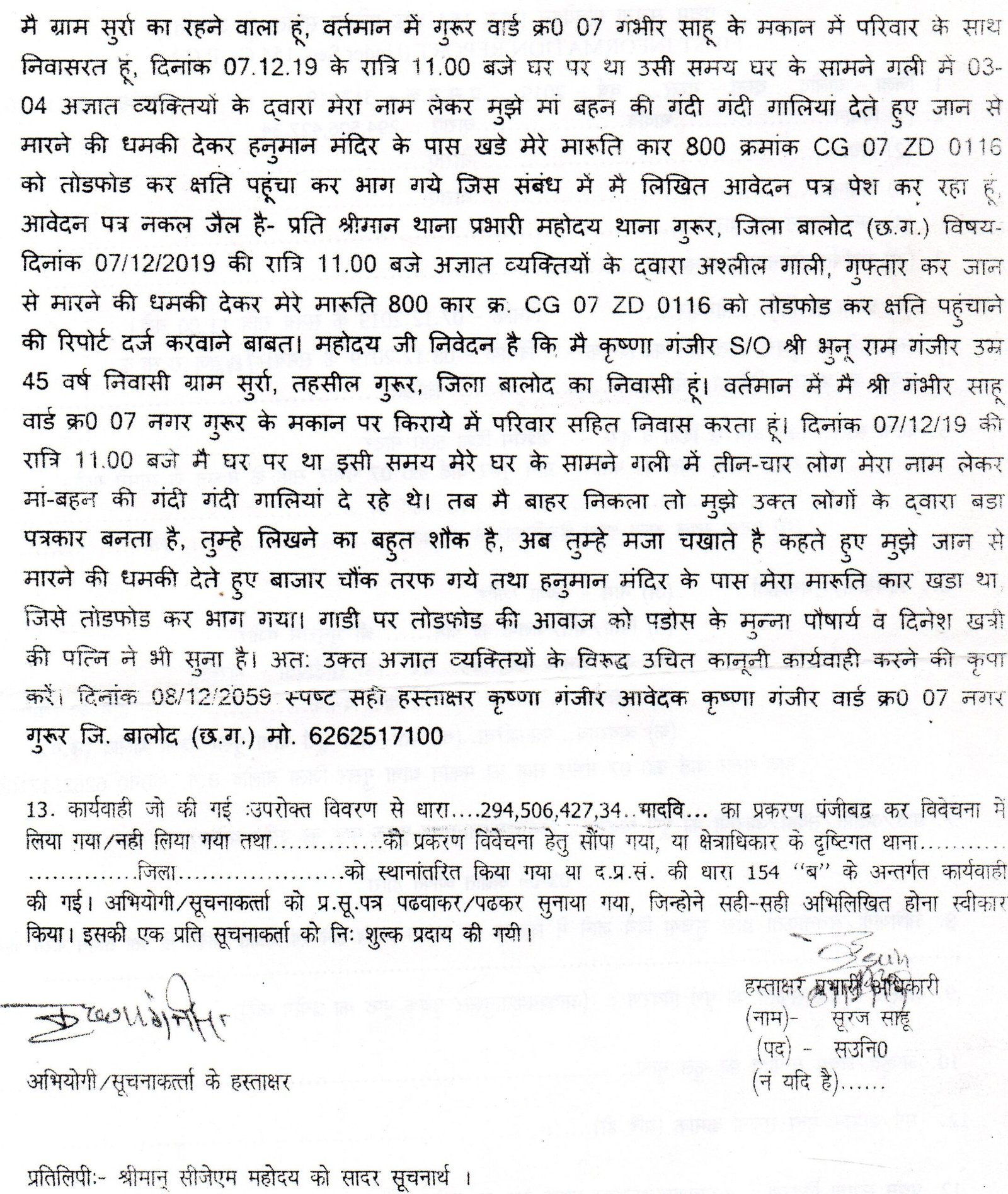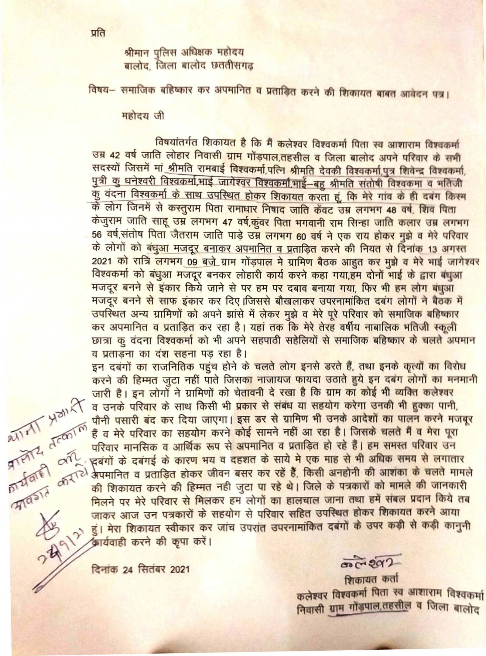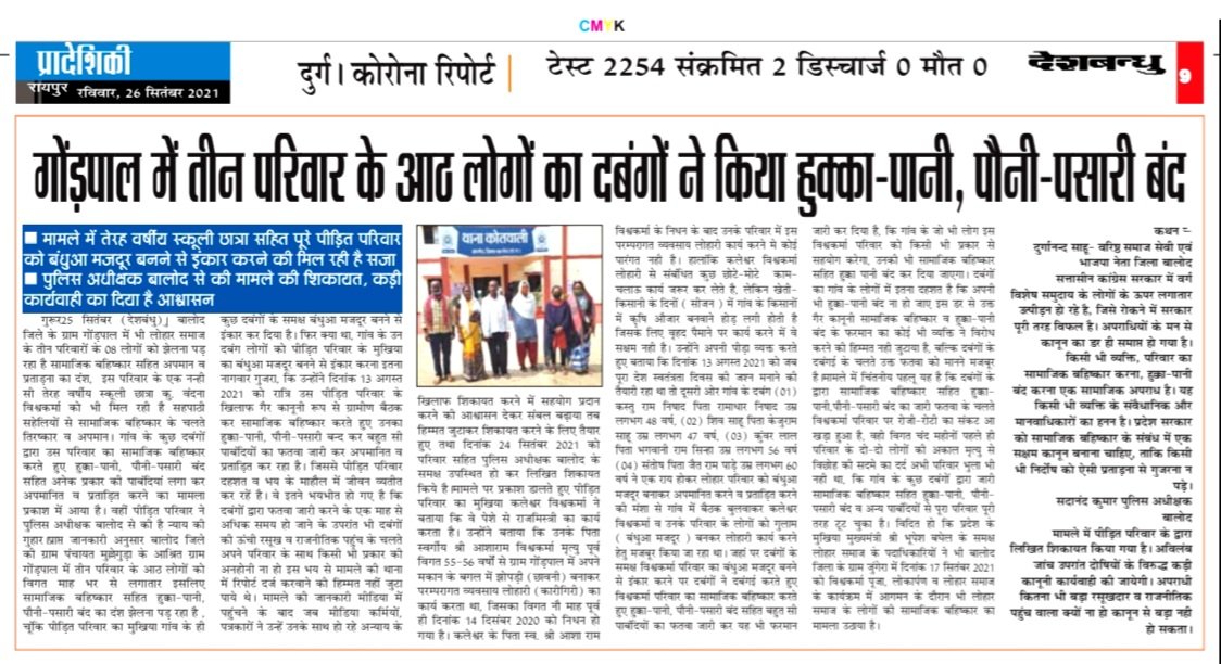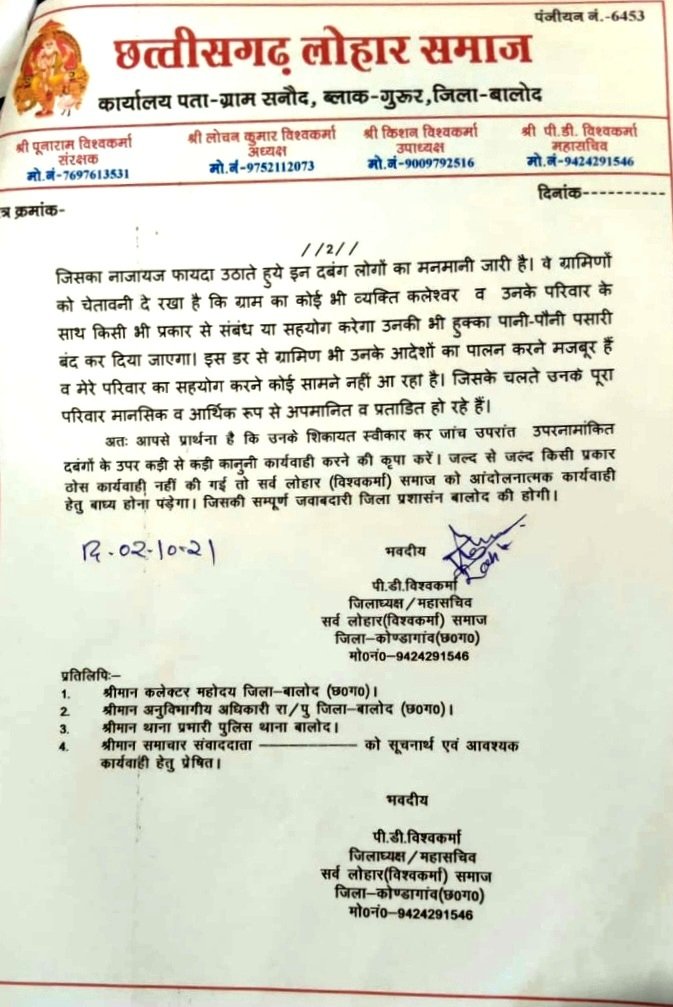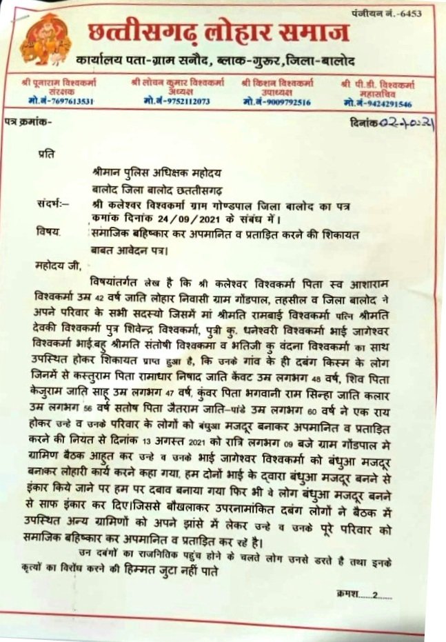 मामले की जानकारी पीड़ित लोहार परिवार के द्वारा लिखित रूप में दिनांक 24 सितंबर 2021 को तत्कालीन पुलिस अधीक्षक जिला बालोद के समक्ष उपस्थित होकर किया गया था। तथा दिनांक 02 अक्टूबर 2021 को सर्व लोहार समाज के प्रदेश महासचिव पीला दास विश्वकर्मा के द्वारा भी पुलिस अधीक्षक बालोद को पीड़ित लोहार परिवार को उचित न्याय दिलाने बात पत्र लिखकर अनुरोध करते हुए आवेदन पत्र की प्रतिलिपि कलेक्टर महोदय बालोद सहित अनुविभागीय अधिकारी बालोद को भी प्रेषित किया गया था।