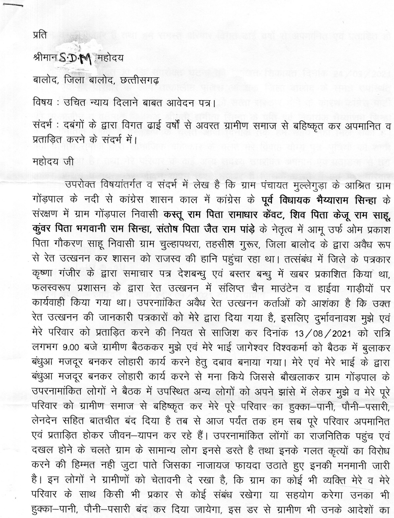 एक कांग्रेसी नेता के संरक्षण में अवैध रेत उत्खनन से चालू होकर ग्रामीण बहिष्कार तक आ पहुंचा है मामला।